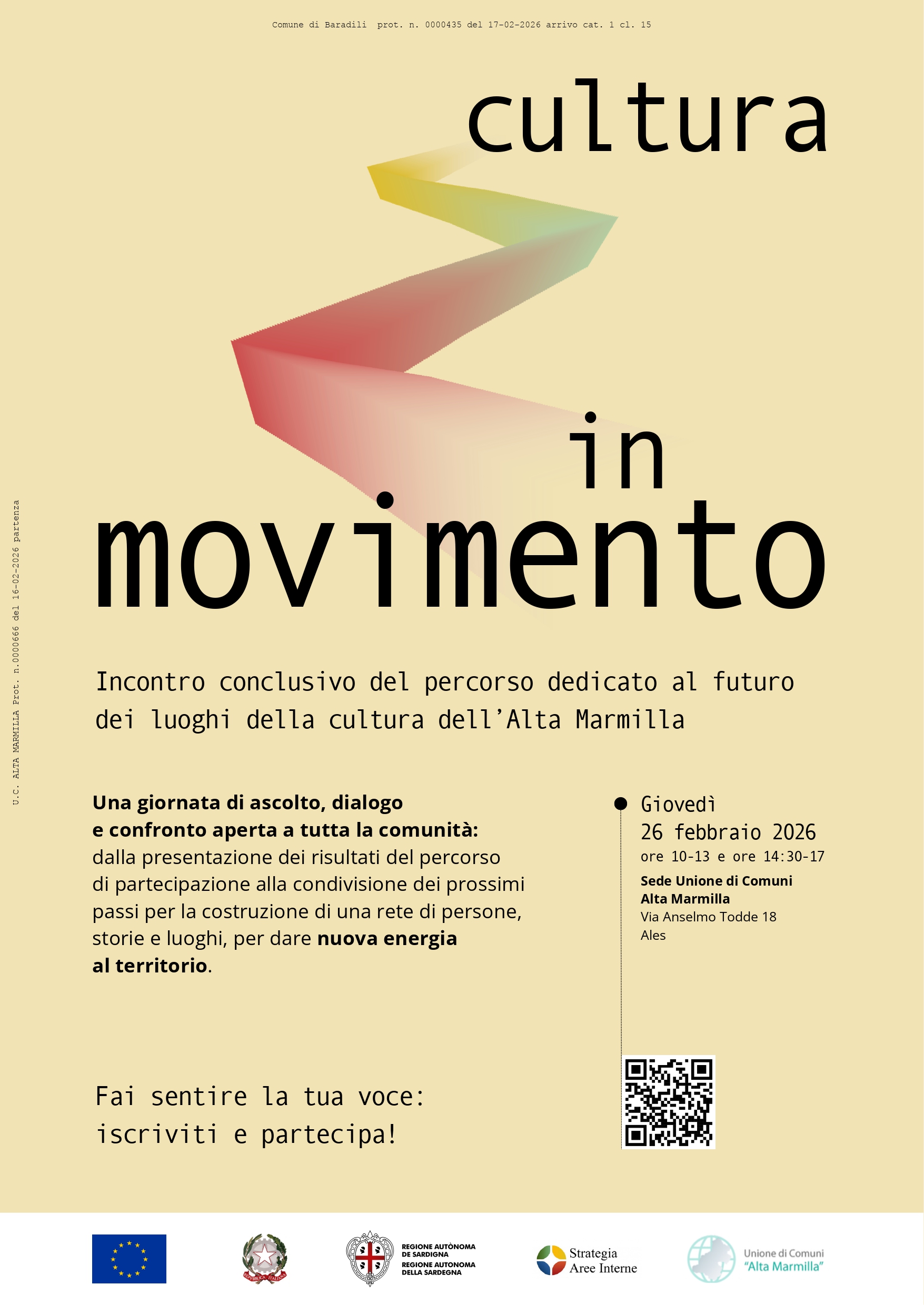 L’incontro conclusivo si terrà giovedì 26 febbraio, dalle ore 10:00 alle ore 17:00, presso la sede dell’Unione di Comuni Alta Marmilla, in via Todde n. 18 – Ales.