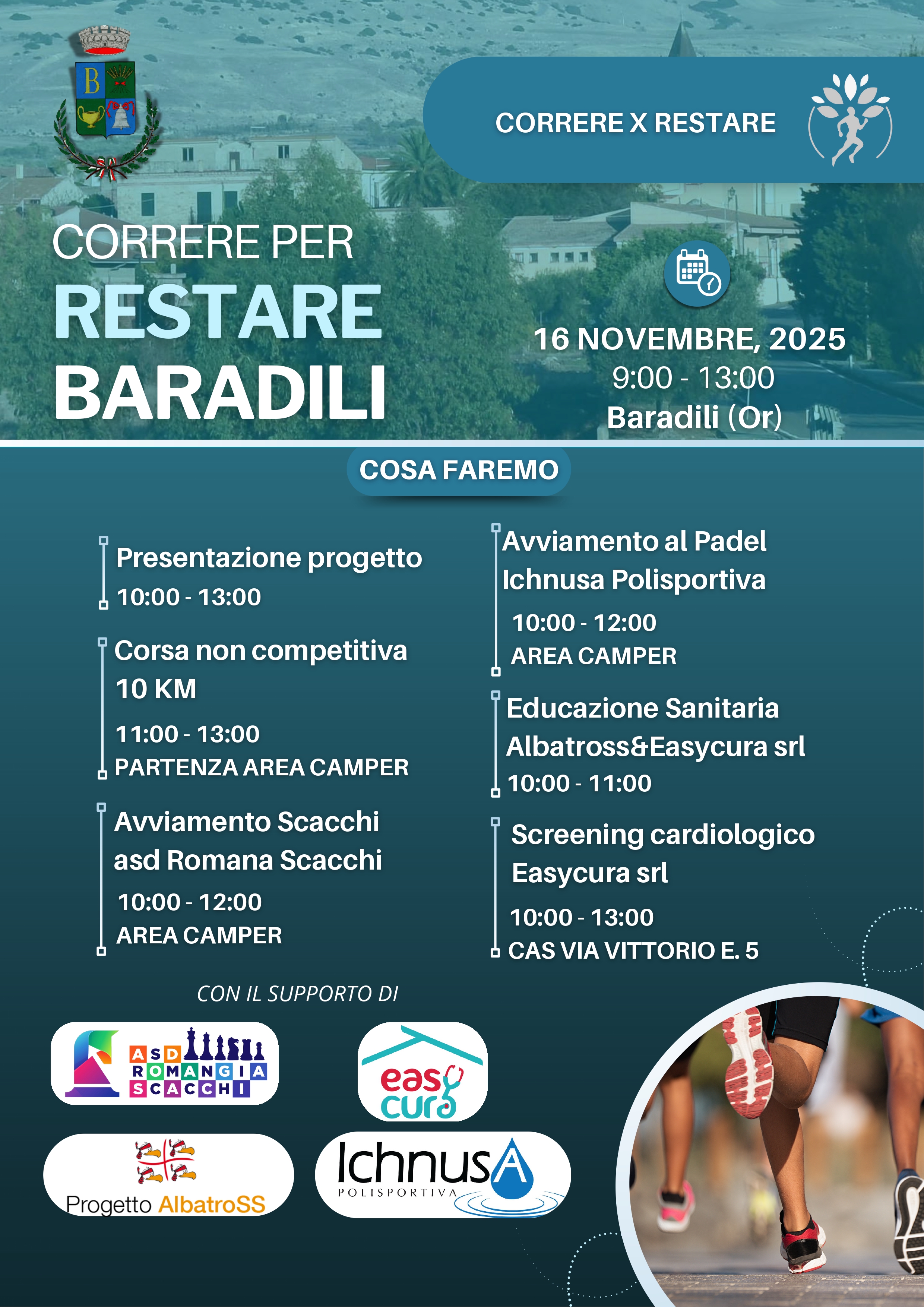 L’evento, realizzato dalla Associazione AlbatroSS in collaborazione con la Associazione Easy Cura, con il patrocinio del Comune di Baradili, intitolato “10 km nei 10 paesi più piccoli della Sardegna – Correre per restare”, prevede una corsa dilettantistica di 10 Km, anche con la partecipazione di persone con disabilità.